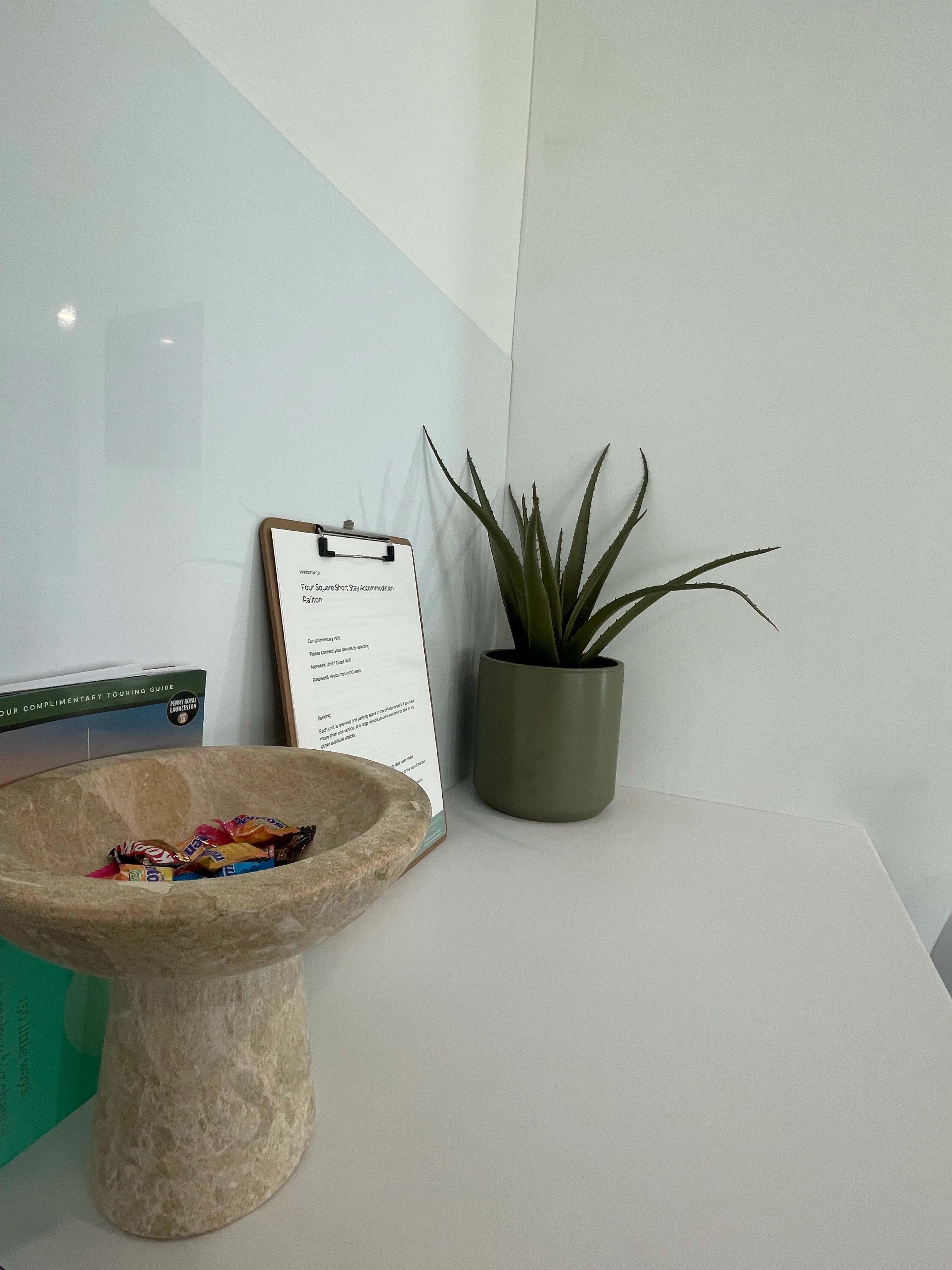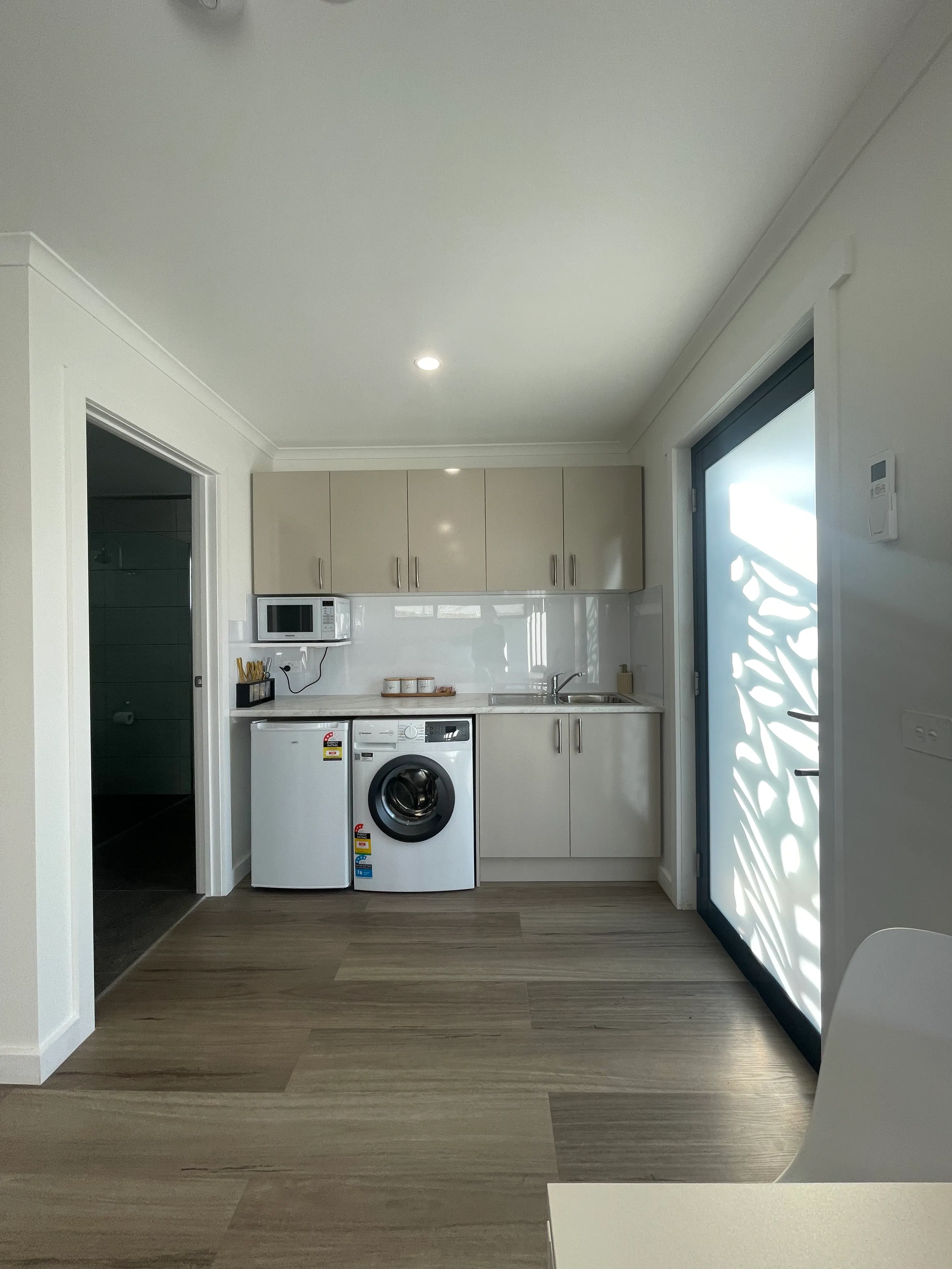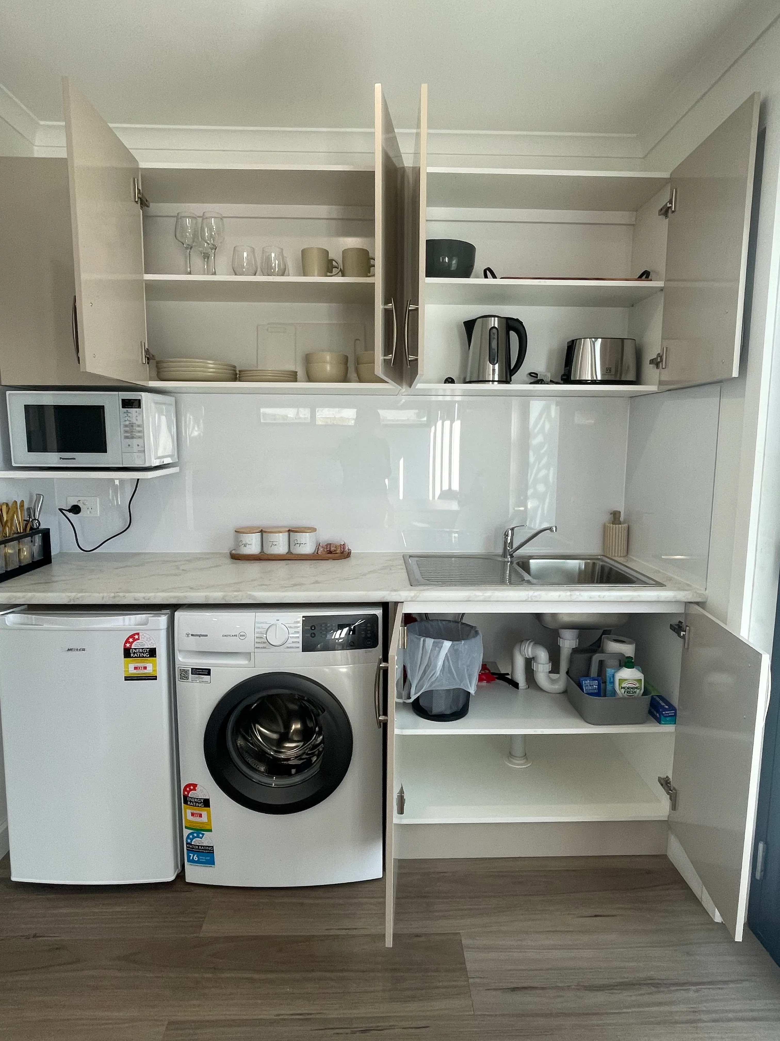A kitchenette, including a kettle and toaster, front load washing machine and wifi are also included.